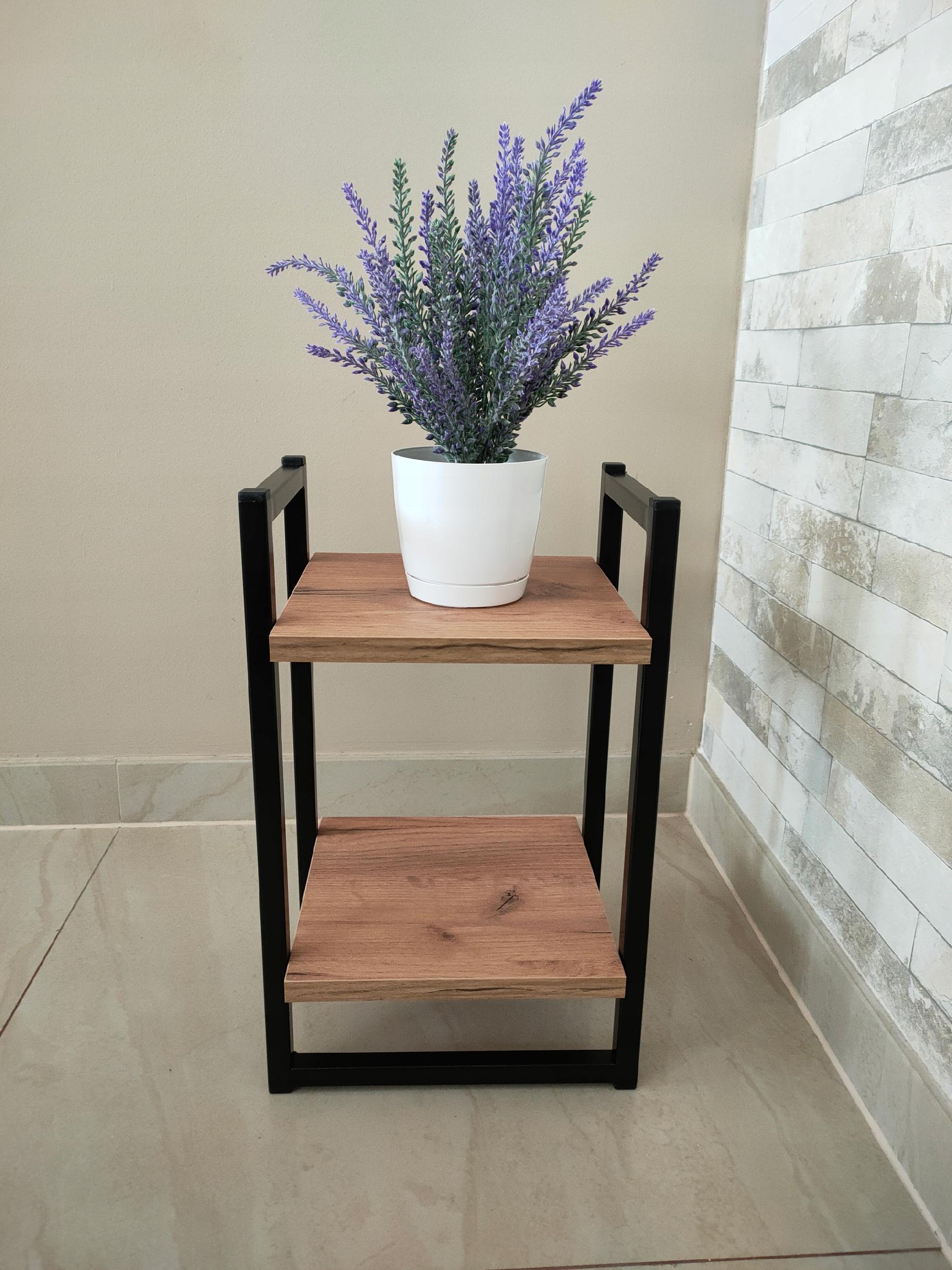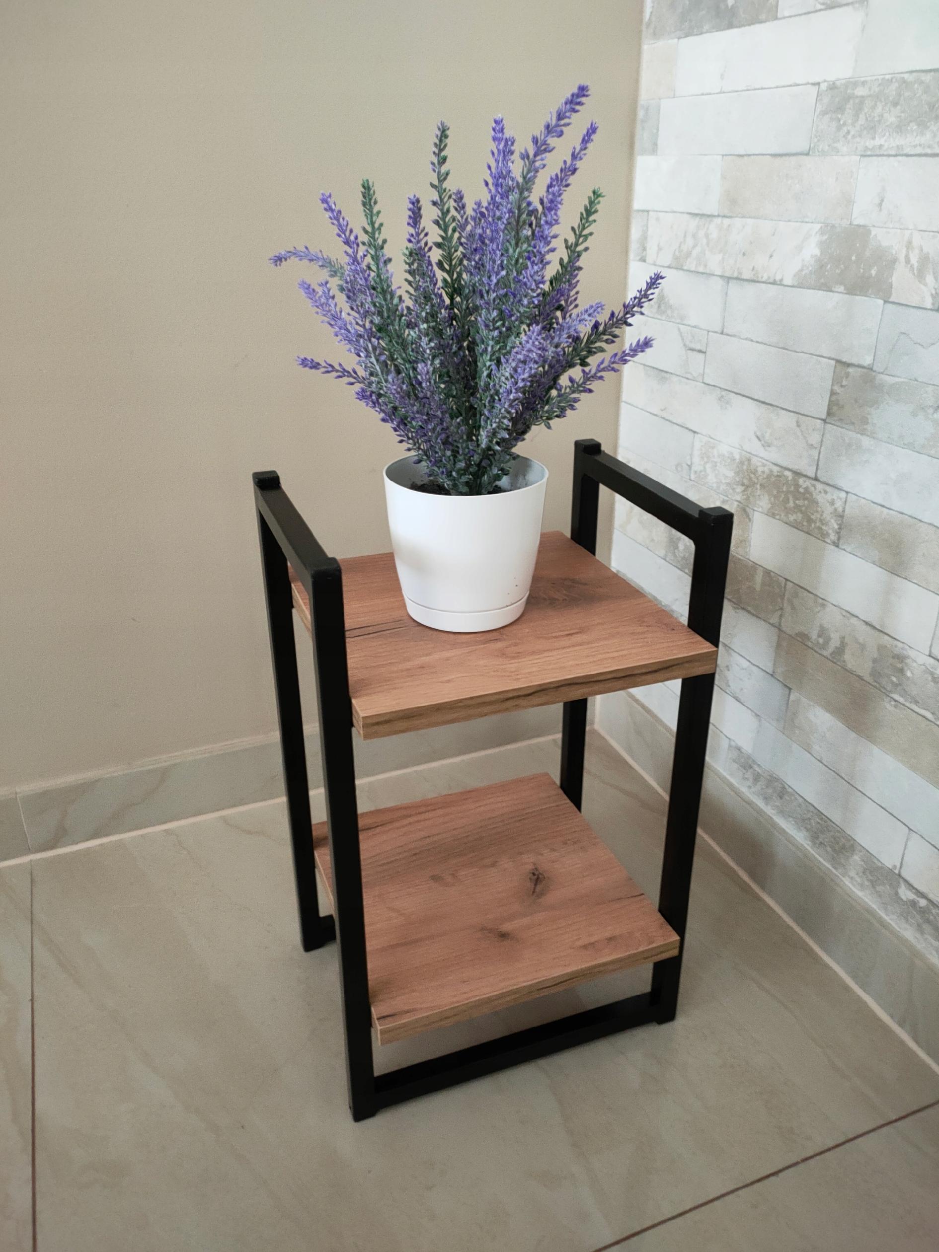 Kwietnik składa się z dwóch półek wykonanych z płyty meblowej o grubości 18mm w kolorze Dąb Craft złoty. Półki umieszczone są jedna pod drugą.